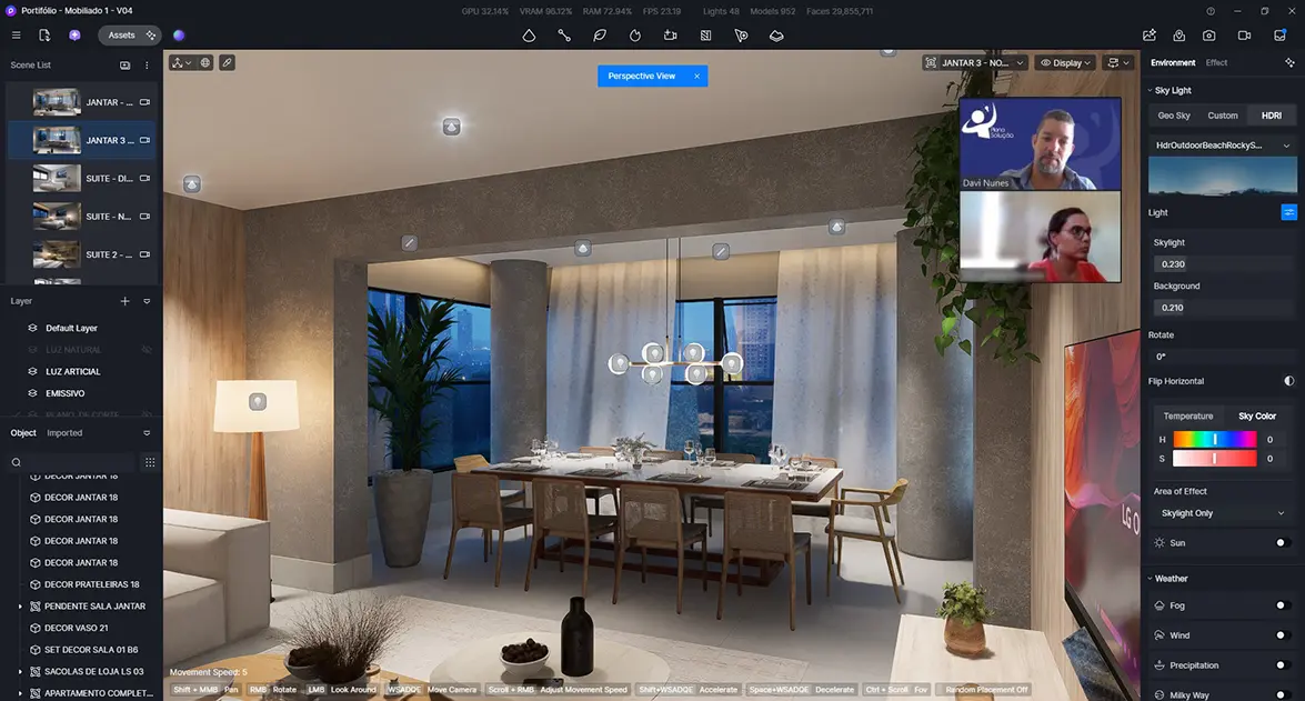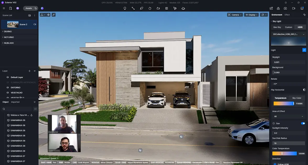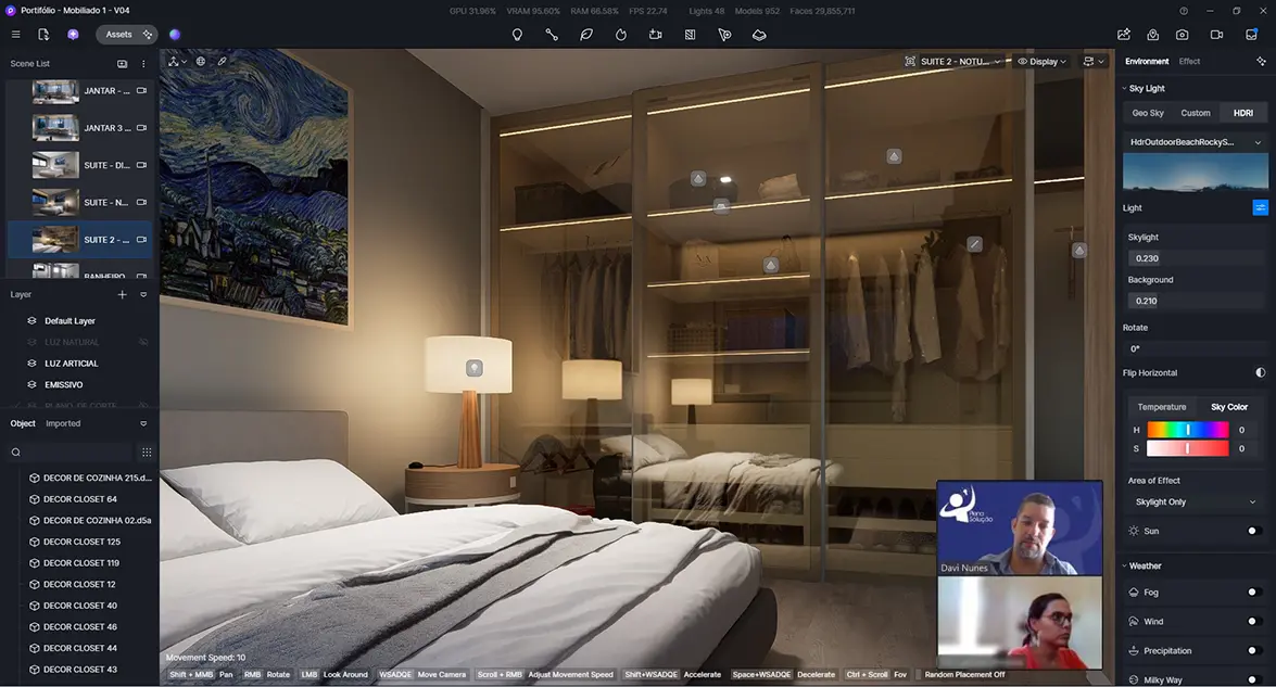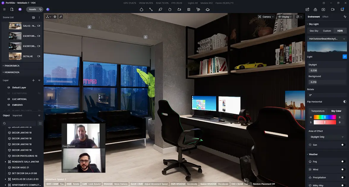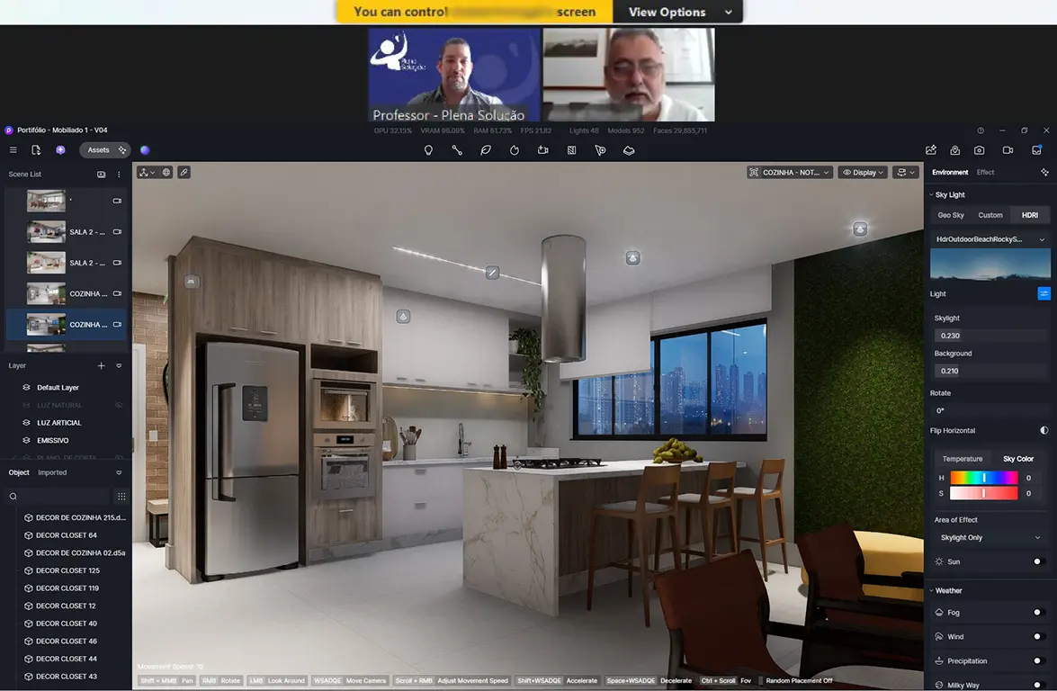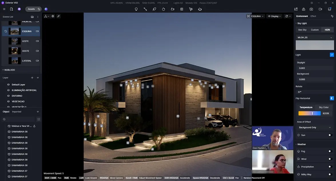 Durante o curso, você aprenderá a trabalhar com bibliotecas inteligentes de materiais e objetos, otimizando seu fluxo de trabalho e garantindo maior realismo aos projetos. O domínio da iluminação em tempo real, ajustes de clima, céu e efeitos atmosféricos permite criar cenas altamente realistas com poucos cliques.